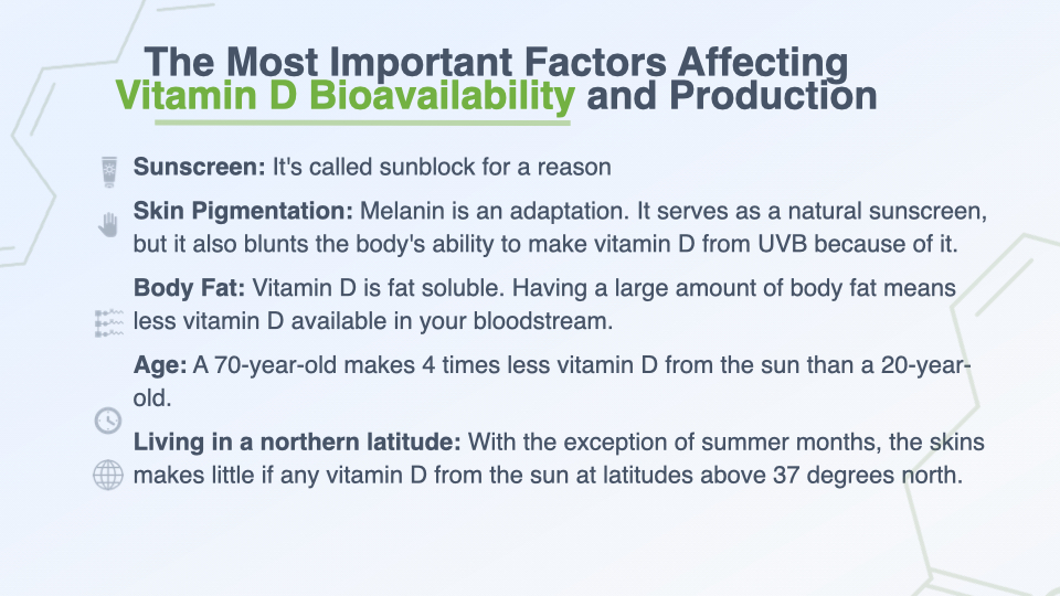 Skin pigmentation: Melanin serves as a natural sunscreen, but it also blunts the body's ability to make vitamin D from UVB radiation. People with darker skin may need up to 10 times longer sun exposure to produce the same amount of vitamin D as those with lighter skin.