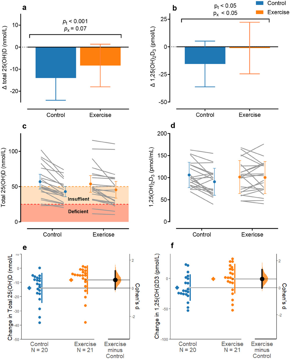 Interestingly, both groups experienced a decline in overall vitamin D status (25(OH)D)—but exercisers had a significantly smaller decrease (15% drop) compared to the non-exercisers (25% drop).