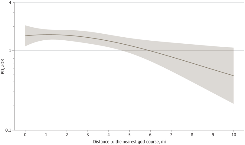 Living within 1 mile of a golf course increased Parkinson’s risk by 126% compared to living over 6 miles away, and the greatest risk (a 198% increase) was observed for those living 1–2 miles from a golf course.