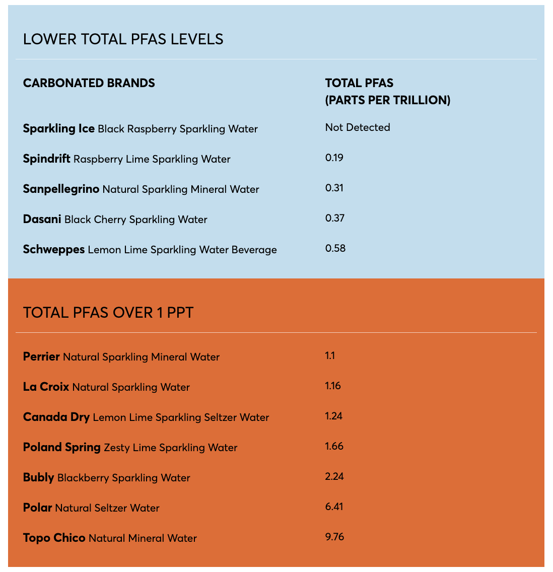 A Consumer Reports analysis in 2020–2022 found that noncarbonated beverages (most of which were bottled in plastic with a few exceptions) had detectable levels of PFAS, including several with total PFAS over the "safe" limit of 1ppt. Only two still water brands had undetectable PFAS levels, and both of them (Mountain Valley spring water and Saratoga spring water) are bottled in glass. However, all carbonated water (including three brands packaged in glass) tested had measurable amounts of PFAS, ranging from 1.1 ppt to 9.76 ppt (a level detected in the popular Topo Chico sparkling water).