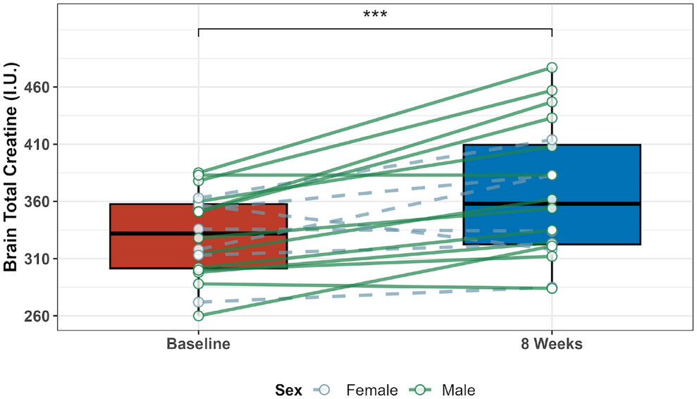 After 8 weeks of supplementation, brain creatine stores increased by an average of 11%, with 17 out of the 20 participants (85%) experiencing an increase in levels of brain total creatine.