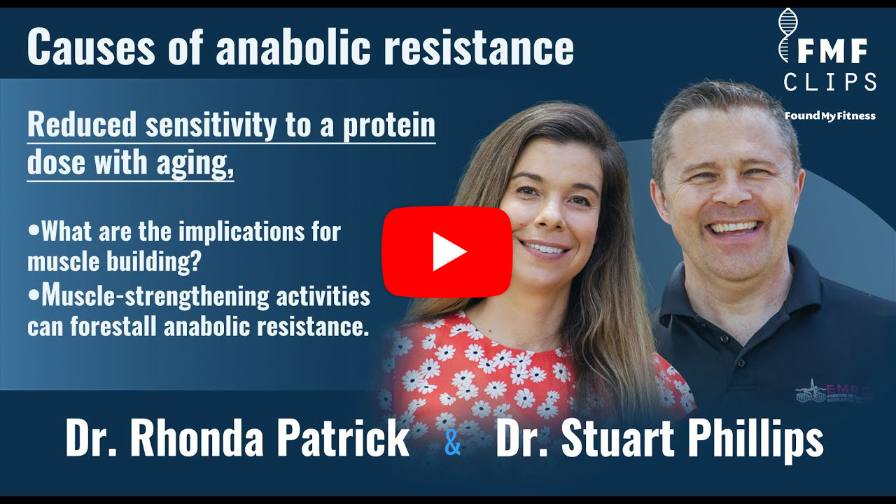 Even though anabolic resistance is thought to be related to age, the role of inactivity has been highlighted as a major (perhaps the main) contributing factor. Only ~1 in 5 older adults perform regular resistance training. That’s a problem because strength training eliminates much of the anabolic resistance—studies by Luc van Loon (who appeared on episode #93 of the FoundMyFitness podcast) show that performing resistance exercise prior to protein intake restores the MPS response so older adults can look metabolically like the young, at the same protein dose.