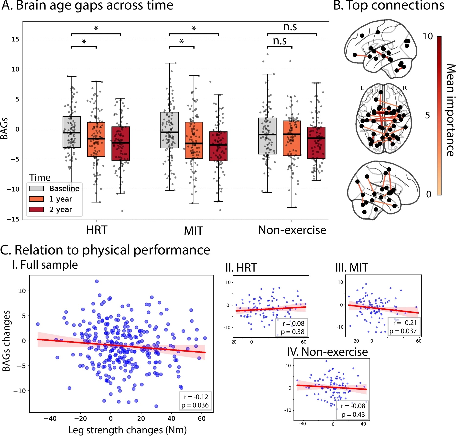 The change in brain age gaps in each training group at baseline, 1 year, and 2 years (A) and the relationship of the change in brain age to changes in leg strength in the full sample and in each intervention/control group (C I, II, III, and IV). |