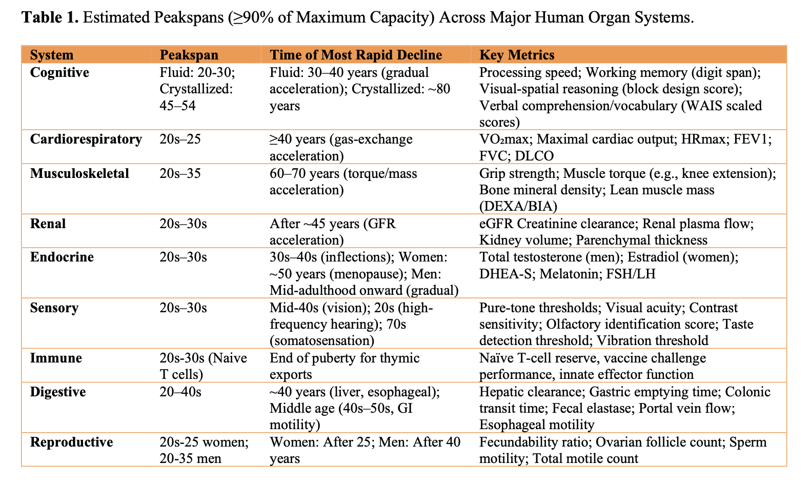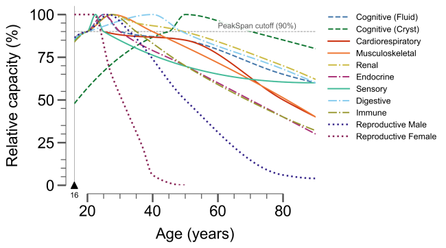 Using the 90% rule, the authors synthesized Peakspans across several biological systems. And one thing is clear—the decline is asynchronous. Different systems peak at different times, and they do not all deteriorate at the same rate.