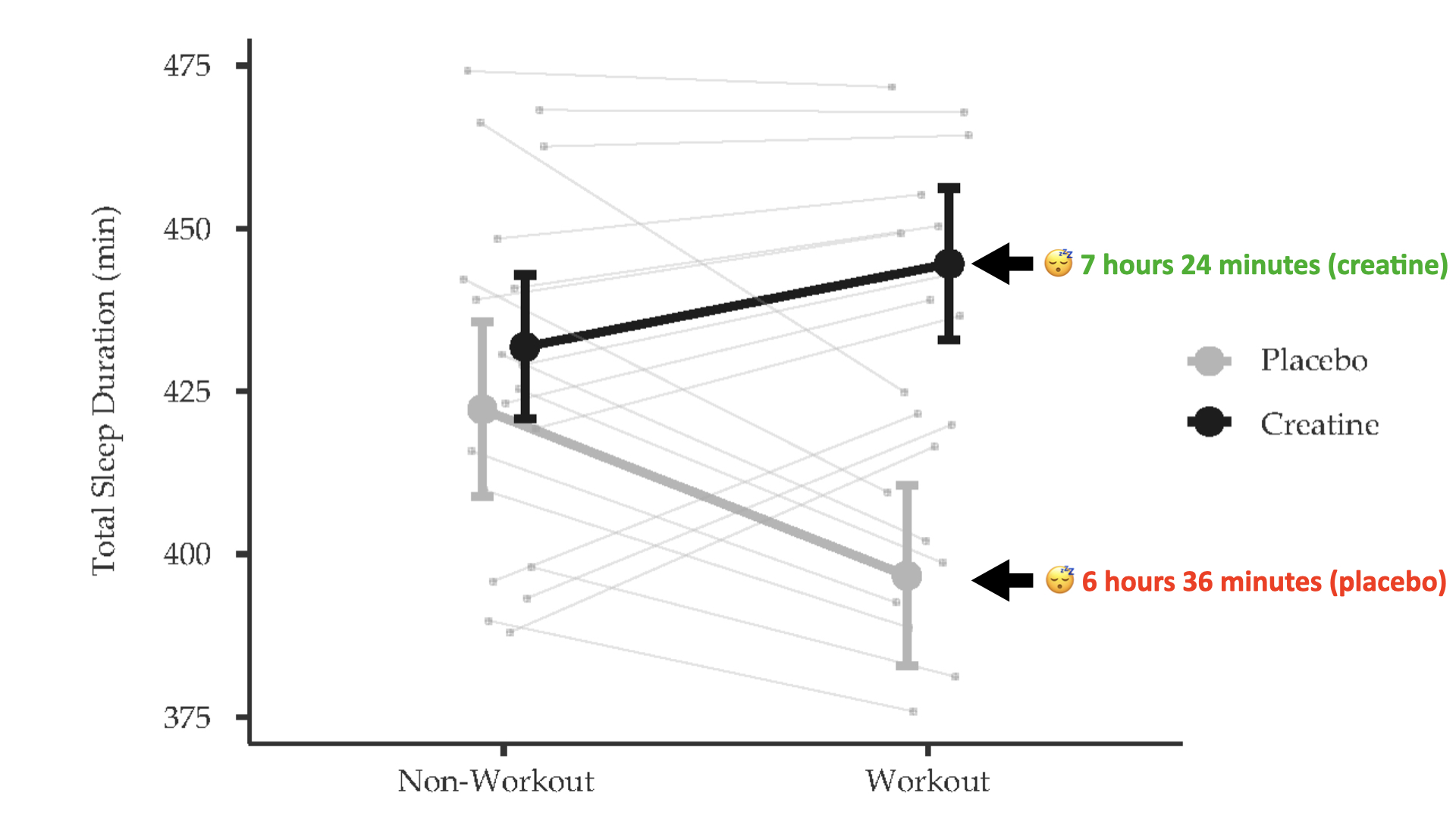 Rather, we should focus on the implications of the interaction between sleep, training, and creatine. Overall, taking creatine did not improve sleep, but I’m not aware of any reason why creatine would improve sleep in adults who are currently sleeping enough. It’s not really a sleep supplement per se.