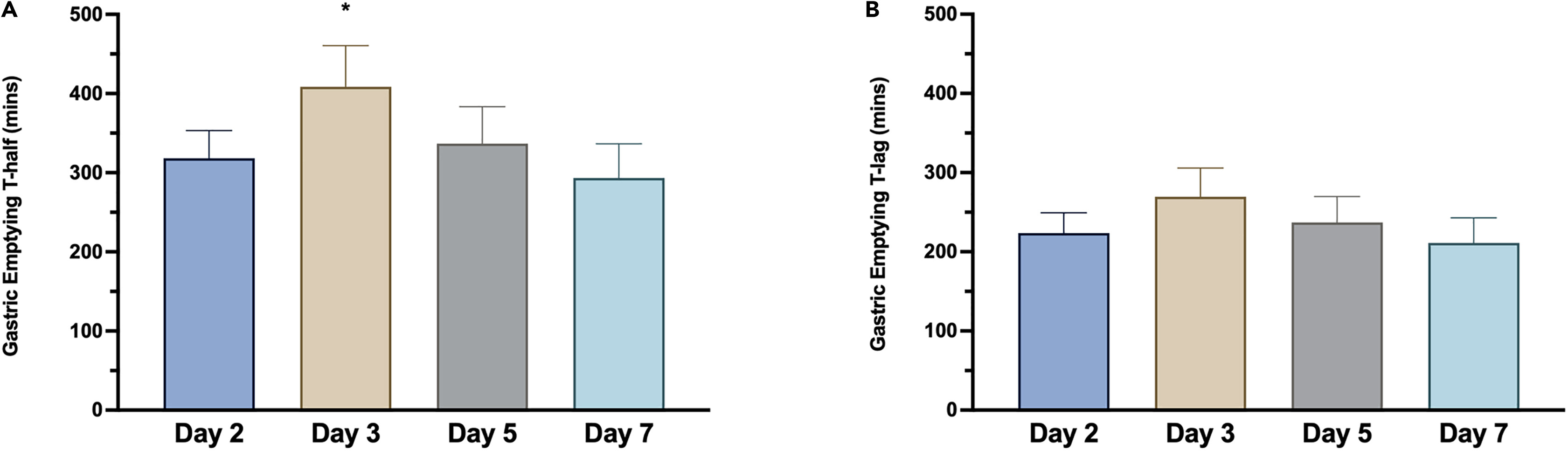 Gastric emptying rate is slower on the first day of the phase shift (day 3).