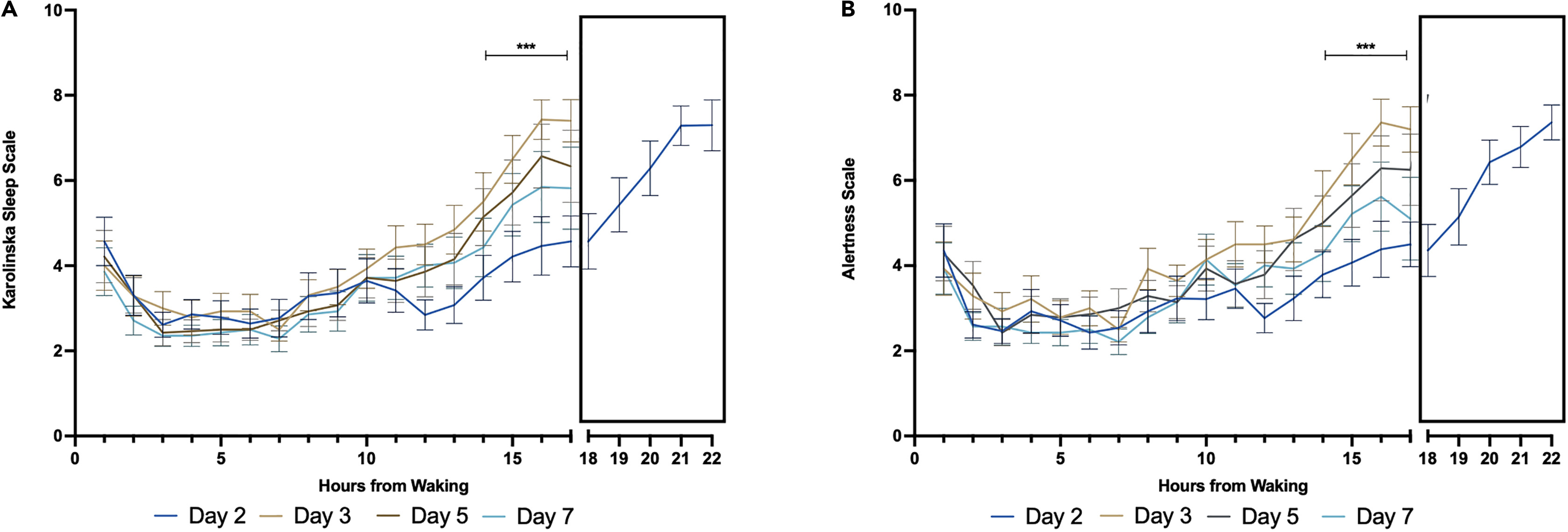 Levels of sleepiness (left) and alertness (right) are reduced on days 1-5 of phase-shifting.